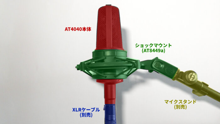 すべて黒色なのでわかりづらいですが、マイクスタンドにショックマウントが取り付けられ、ショックマウントの中央にAT4040が固定され、AT4040の底の部分にマイク(XLR)ケーブルが接続されるかたちになります。