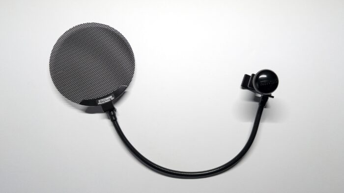 これが気になる場合は、マイクと口の間にポップガード(ポップフィルター、ポップスクリーン)という網を立てる(マイクスタンドにクランプで取り付ける)ことで軽減することができます。