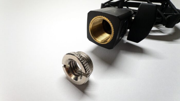 付属する3/8″-5/8″変換ネジ(手前)と、5/8″ネジのショックマウント(奥)