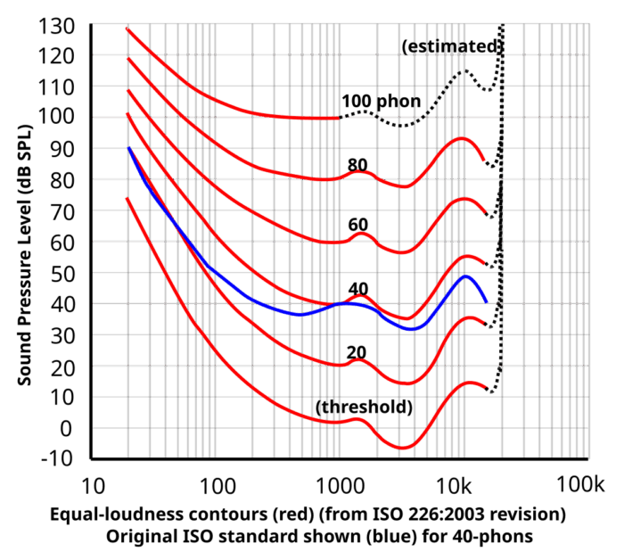 このグラフが言いたいのは「ヒトは音が低いほど鈍く、ちょっと高いところ(真ん中の一番下がっている部分)がいちばん敏感で、そしてそれより高い音は鈍い」ということです。